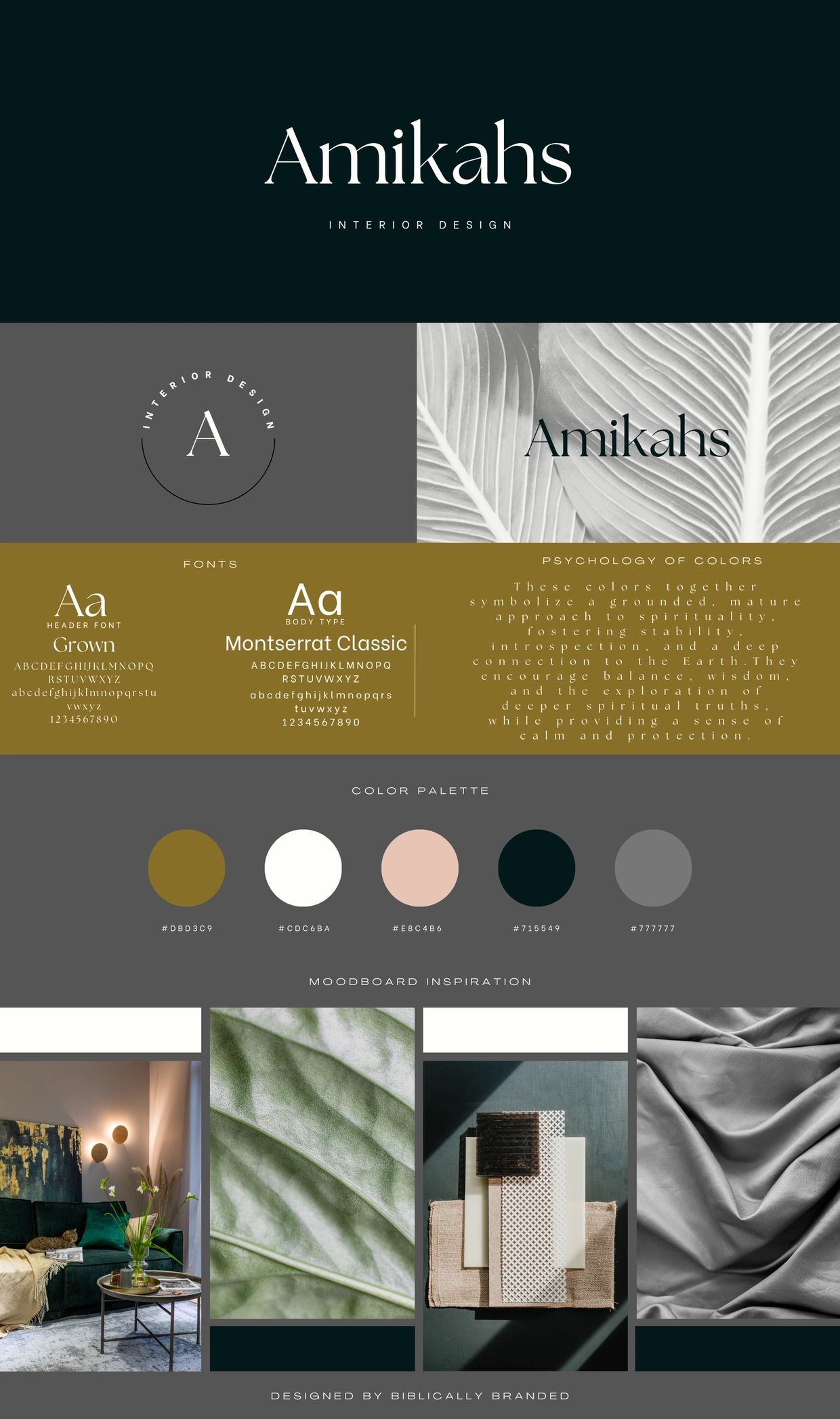 This brand board seamlessly blends softness and boldness to create a grounded yet elegant aesthetic. The color palette reflects a harmonious balance, with earthy greens and grays representing strength and stability, softened by warm, neutral tones for a sense of calm and sophistication. The combination of modern typography and serene visuals captures a mature, introspective energy while maintaining an approachable and refined style. This design embodies the perfect mix of strength and grace, ideal for a brand rooted in creating spaces that inspire balance and beauty.